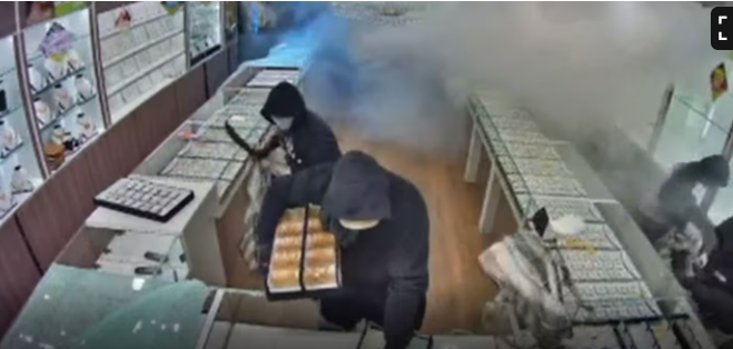 在混乱中,劫匪们毫不留情地砸碎橱柜,将价值百万的珠宝和黄金装进包中。