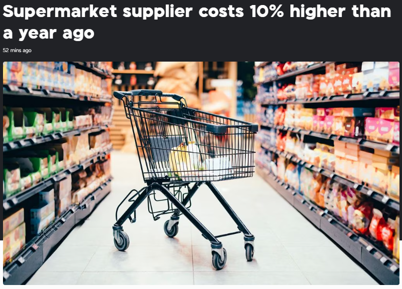 根据今天发布的新数据,新西兰超市供应成本比一年前上涨了 10%。