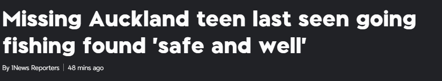 今早,新西兰各大媒体刊登寻人启示——16岁男孩出门钓鱼好几天没回家,疑似失踪。