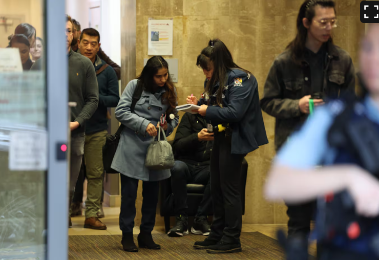 两名警察驻守Auckland Harbour Suites公寓大楼,对居民或目击者展开询问。