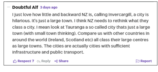 有华人网友把因佛卡吉尔市描述为“沟里”、“很致郁”。“耐得住寂寞的话其实那地方还行,距离皇后镇,峡湾倒也相对近。“重点是不堵车,吃啥海鲜可以自己捞,周边的步道、小花园挺不错。有位华人网友说:“喜欢这里拍出来的照片,但自己去就算了,还是奥克兰方便。”新西兰本地媒体“全纽最低房价”这篇报道发布后,也引起了不少本地网友的关注、