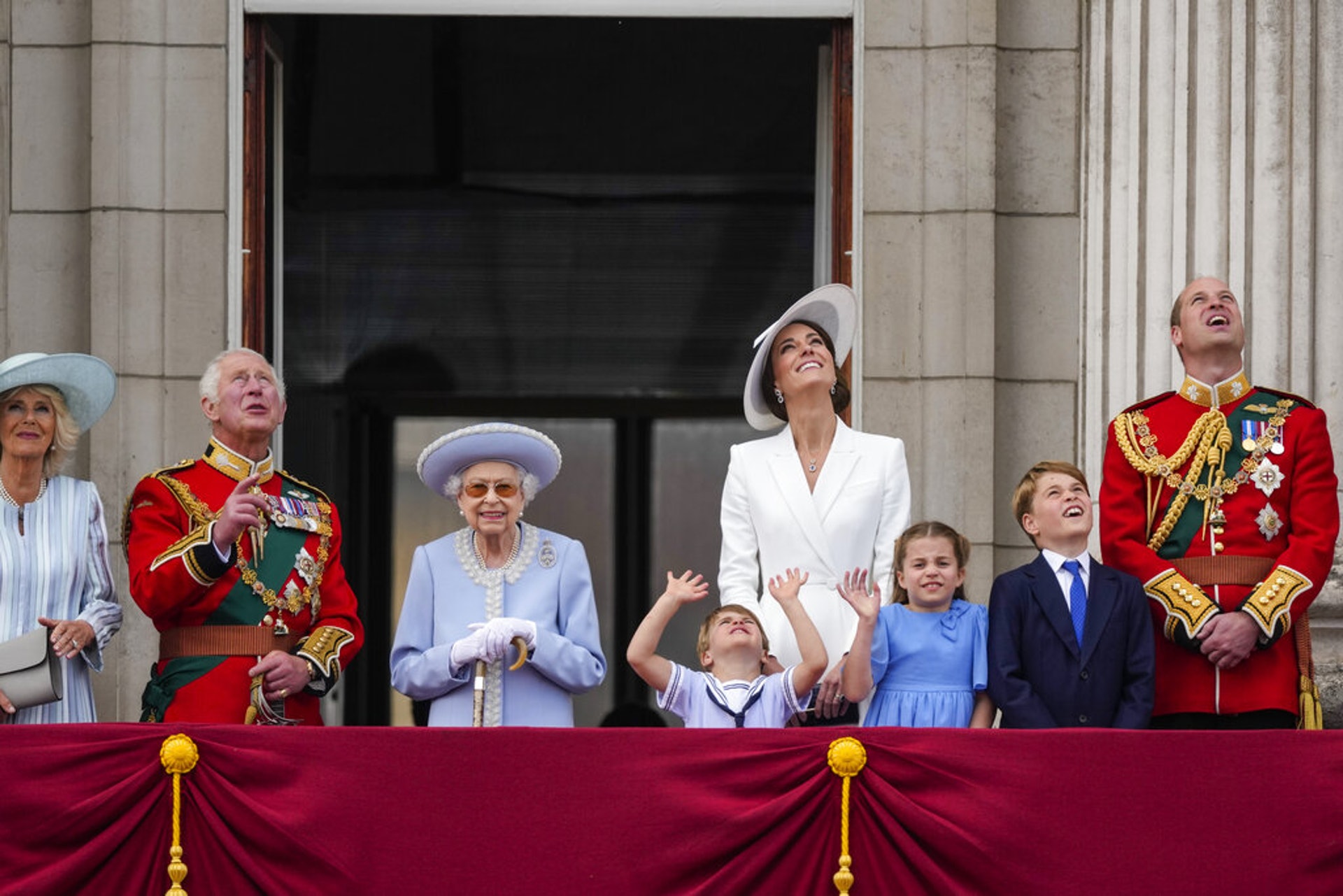 卸下王室职位的哈利与梅根专程返国,但没有被安排和女王一起站在白金汉宫阳台上。王储查理斯(Prince Charles)夫妇、威廉王子(Prince William)一家在内的王室成员,都在阳台上观礼。