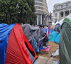 惠灵顿一夜之间的大雨并没有阻止占领议会草坪和周边地区的抗议者。许多抗议者穿着夹克或雨衣--今天早上一直在一个食品摊位前排队购买早餐和咖啡。地面是湿漉漉的,但为了防止太过泥泞,周围已经铺上了垫子和干草。